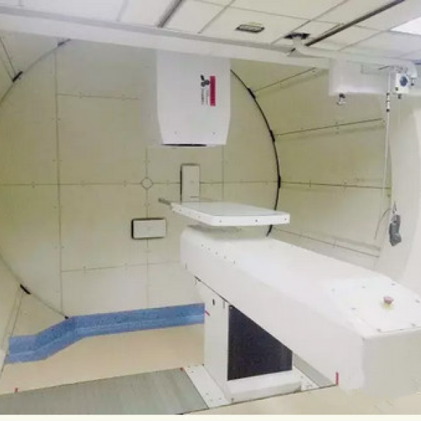 为进一步促进该技术在中国的发展,1999年中国科学院高能物理研究所质子治疗技术研究组邀请了部分专家撰写了《质子治疗技术基础》一书,着重介绍了质子治疗技术的有关基本原理、治疗装置、剂量计算方法和相关技术。2004年北京质子医疗中心(筹备处)组织了肿瘤医学、高能物理、医学工程、环境保护、辐射防护等领域的专家编写了《肿瘤质子治疗学》一书,旨在使国内放射肿瘤学界学者们,全面了解质子治疗发展历史、有关物理学和生物学基础、治疗装置及临床治疗结果。国内有数个单位正在积极地考虑筹备质子装置建立。1989 年兰州近代物理所建立了兰州重离子研究装置,1995年开始了重离子治 疗 肿 瘤一的研究工作。中国从1996年开始有几个肿瘤治疗中心,包括山东淄博万杰医院、上海复旦肿瘤医院和北京中日友好医院,开始了质子治疗设备引进工作;到2004年末,山东淄博万杰医院引进的比利时IBA(ion beam application)公司的质子治疗设备开始投入使用。全套设备由质子加速器、束流输运系统、束流配送系统、剂量监测系统、患者定位系统和控制系统构成。占地面积5000多平方米。可以提供70MeV-230MeV的质子束,可以用于治疗体内任何部位的肿瘤(图3,4)。至今已治疗820多例肿瘤患者。